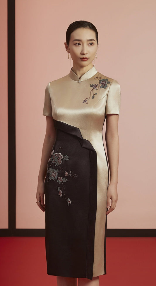Elegant Contrast: Modern Qipao with Floral Accents-Cream and Black